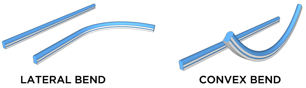 - LED Hybrid 2 Lights: LED tape-rope Hybrid 2 lights are not designed to bend laterally. They have a 1-1/2" minimum convex bending radius.