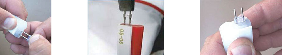 (On Polar Neon V1, the wires are located on the bottom.) Using flat nosed pliers, position the power pin within the jaws of the pliers so that the sharp, barbed ends of the pin are facing outward.