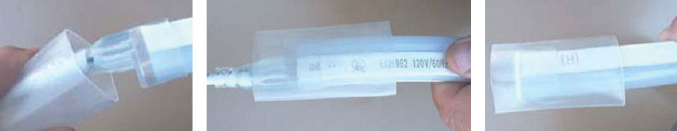 Placing heat shrink tubing can provide additional weatherproofing at LED Neon Flex joint connections. Slide a piece of heat shrink tube over each connection point. Place the tubing evenly over the join area to be covered on the power cord. On all other connectors (end cap, X, T, L, Inside Corner, Outside Corner etc.) place the shrink tube so that it extends past the end approximately 1/8th of an inch. Once you have positioned the heat shrink tubing where needed, use a heat gun to shrink the tubing to wrap around the LED Flex Neon connection points.