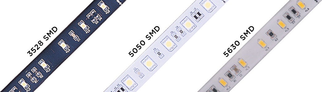 The 3528 SMD is a single-chip medium-output LED. The 5050 SMD is a larger, three-chip high-output LED that has approximately 3X the brightness of the 3528. We also carry some products that utilize a new 5630 SMD chip. These newer LEDs are even more powerful than the 5050 SMD lights.