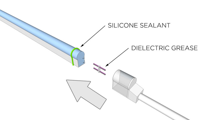 - After the pins are properly inserted into the light and connector accessory (power cord, extension, splice, etc.), all plastic to plastic surfaces should be sealed with either a silicone sealant or aquamarine sealant (used to seal leaks in fish tanks). This will create a weatherproof moisture barrier around your linear light connection and help resist any water, moisture or condensation from entering or damaging your connections.