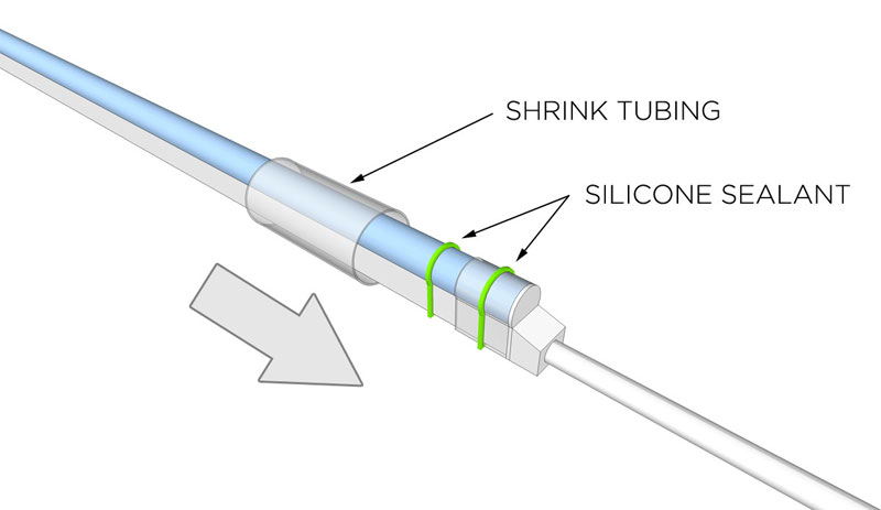- Additionally, a heat-shrink tube covering the entire connection will help create another layer of protection. Here too, the plastic to plastic surfaces, between the shrink tube and the light connection, should be sealed with sealant.